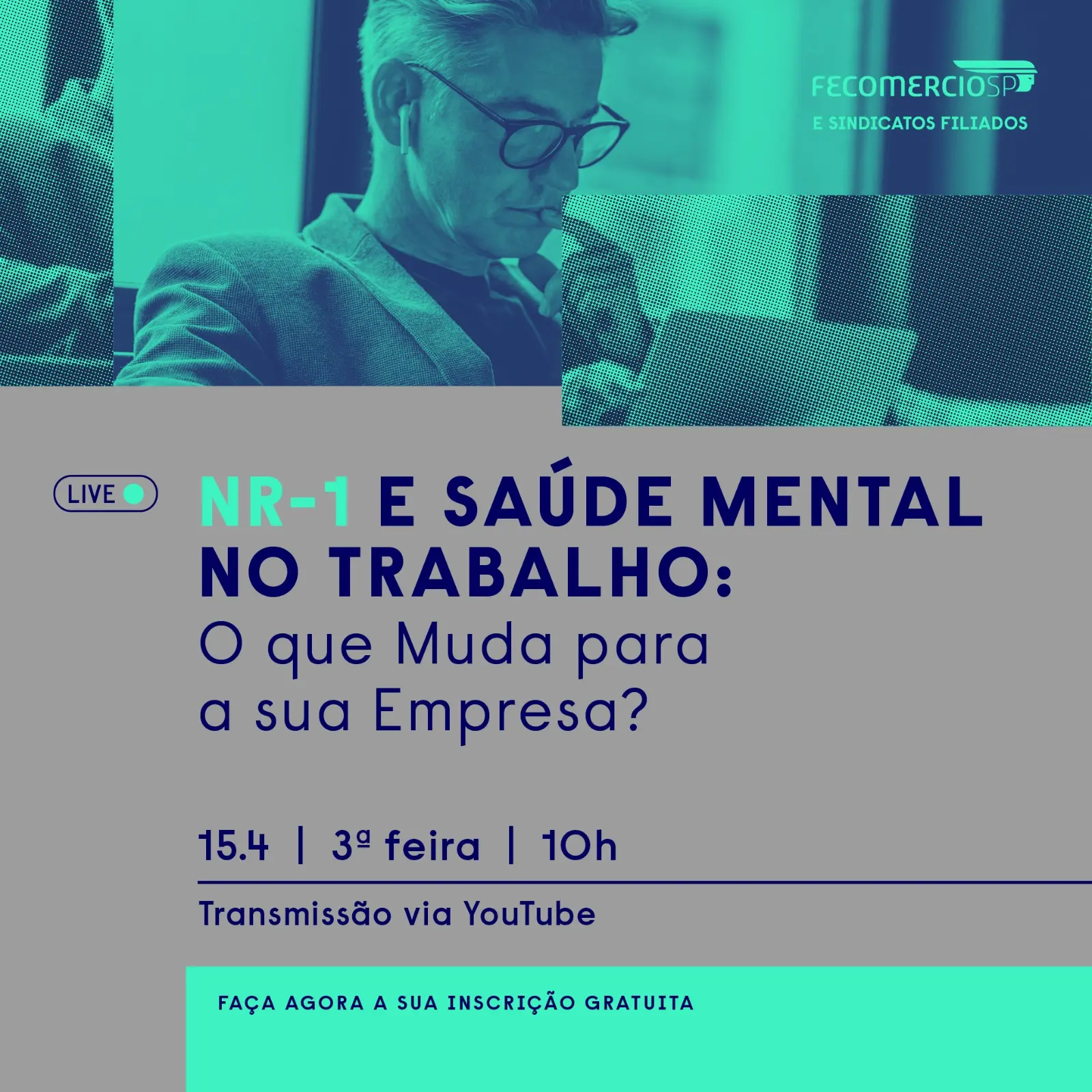 ✔ Para ajudar as empresas, a FecomercioSP vai promover a live NR-1 e Saúde Mental no Trabalho, que vai explicar as ações preventivas mais importantes, esclarecer as mudanças e expor os principais reflexos da norma.