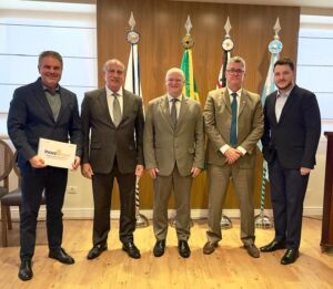Durante o encontro, o presidente do Sindilojas, Sr. Carlos Augusto Gobbo, esteve com o desembargador Dr. Fábio Bueno de Aguiar, coordenador da comissão de acessibilidade e da pessoa com deficiência, acompanhado dos desembargadores Dr. André Augusto Ulpiano Rizzardo e Dr. Marcelo Garcia Nunes, coordenador da comissão de proteção à pessoa idosa do Tribunal, além do Sr. Gustavo Wattenberg Gobbo, diretor do Sindilojas, para apresentar o Projeto Lei 50+ e a plataforma InovaVagas como uma solução que conecta experiência profissional a novas oportunidades e promovem a inclusão produtiva de trabalhadores com mais de 50 anos.